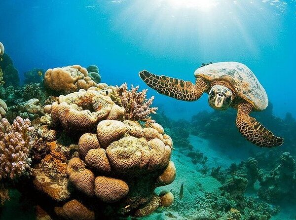 An amazing bay that is home to good-natured sea turtles and dugongs (sea cows).